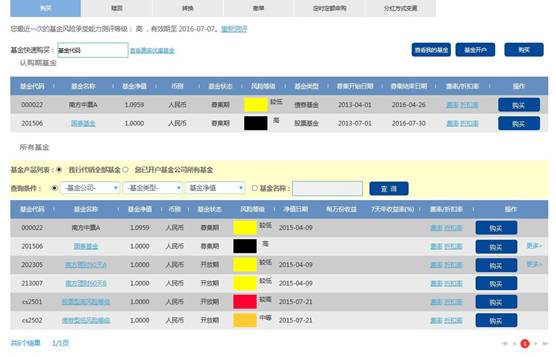 在中信银行个人网银,使用‘投资理财>基金>基金交易-购买’进入基金购买页面,系统自动返回我行代理的各类基金产品信息,包括可认购和申购的基金产品,在拟购买的基金的操作栏内,点击“购买”。如下图: