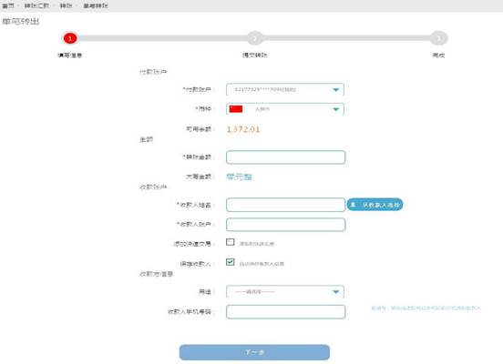 1.点击个人网银“转账汇款-转账-单笔转账”功能菜单,进入单笔转账页面。