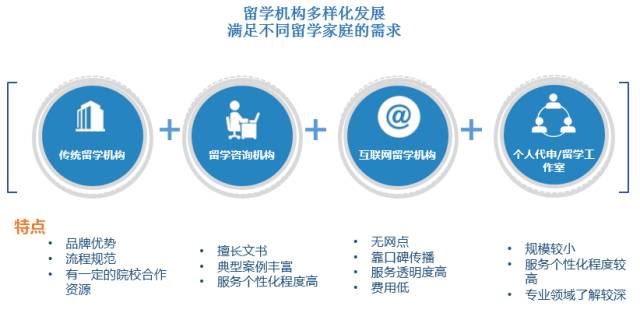 总体来看,大型中介机构运营模式开始升级:积极拓展海外业务,延伸留学产业链;聚焦小众市场,服务垂直化全面覆盖;定位高端名校,定制化专业服务等成为主要趋势。